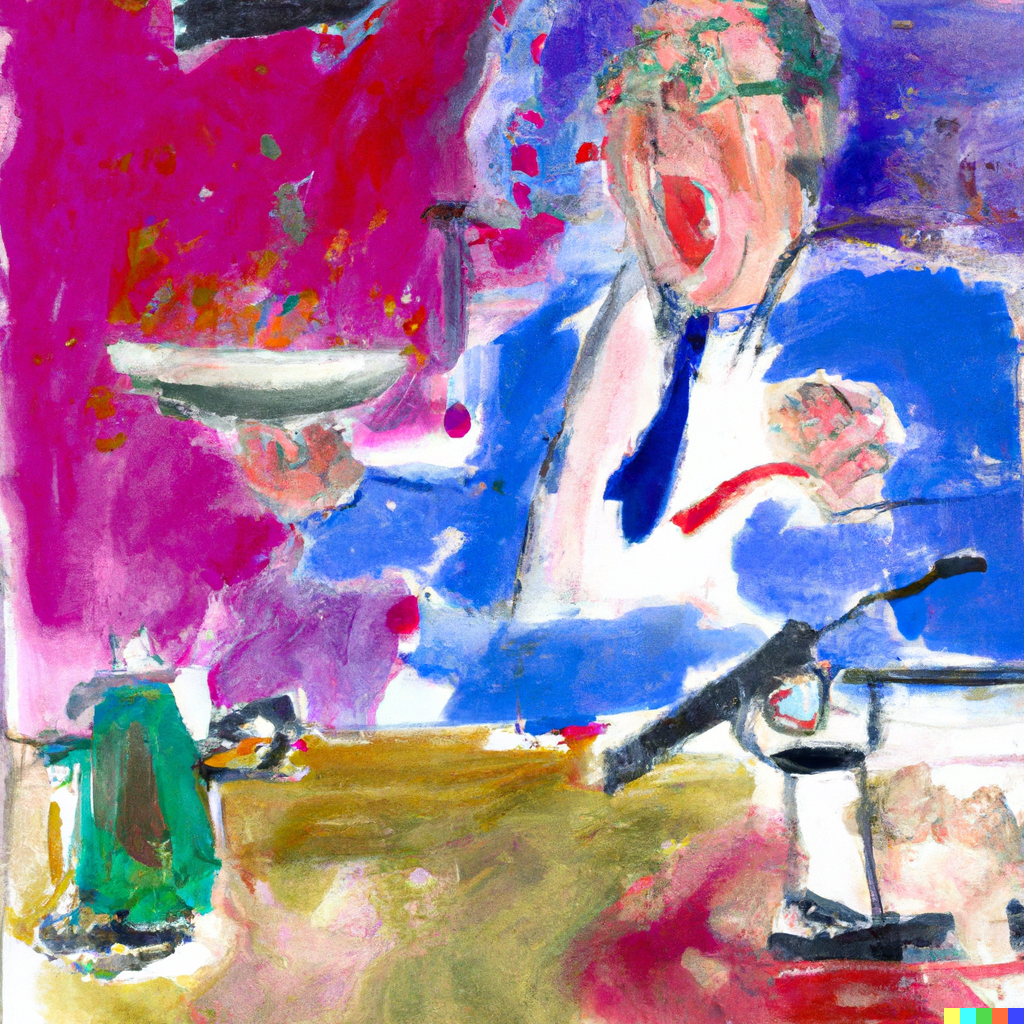 ちなみに上の画像は “This colorful Turner-esque painting depicts a frightening image of a jovial middle-aged Japanese man in a suit, glasses, and short, inverted hair, yelling as he grabs the morning Japanese-style set meal on the table.” (スーツに眼鏡、逆立った短髪の陽気な中年日本人が、テーブルの上の朝の和定食を手に取りながら叫ぶという恐ろしいイメージが描かれている、ターナー風のカラフルな絵)という文章で生成したもの。