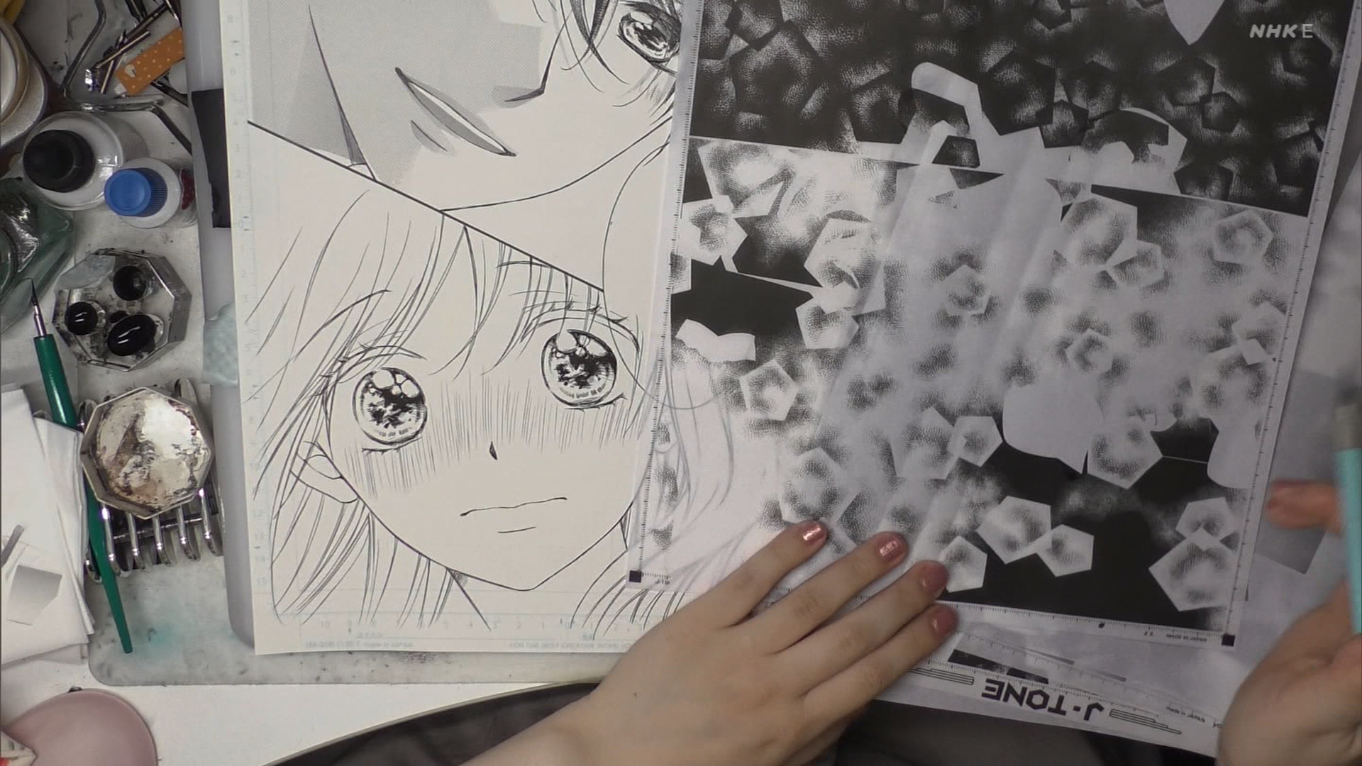 絵柄は全然自分の好みと違うけど、髪にトーンをつけてく段階で、ザクザクスクリーントーンをアドリブで切り貼りしながら絵を作ってゆく様が結構すごくて面白かった。デジタルでやる事も出来るだろうけど、あの身体的な作業がいいんだろうなと思う。