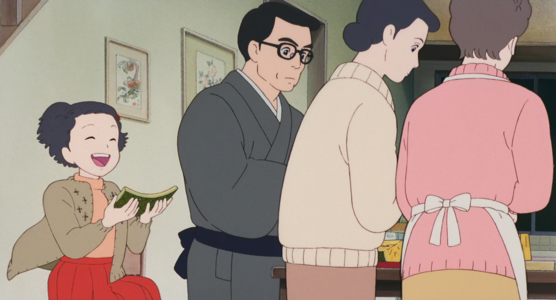 ちなみに、その朝食の準備をするシーンで母親にパンを取ってくるように頼まれたトットちゃんが踊るように跳ねながら画面上手にはけていくアニメーションは、『おもひでぽろぽろ』のパイナップルを家族で食べる回想シーンで、切り分けられたパイナップルの皮を両手で持って踊るタエ子の事を思い出して、良いなと思った。