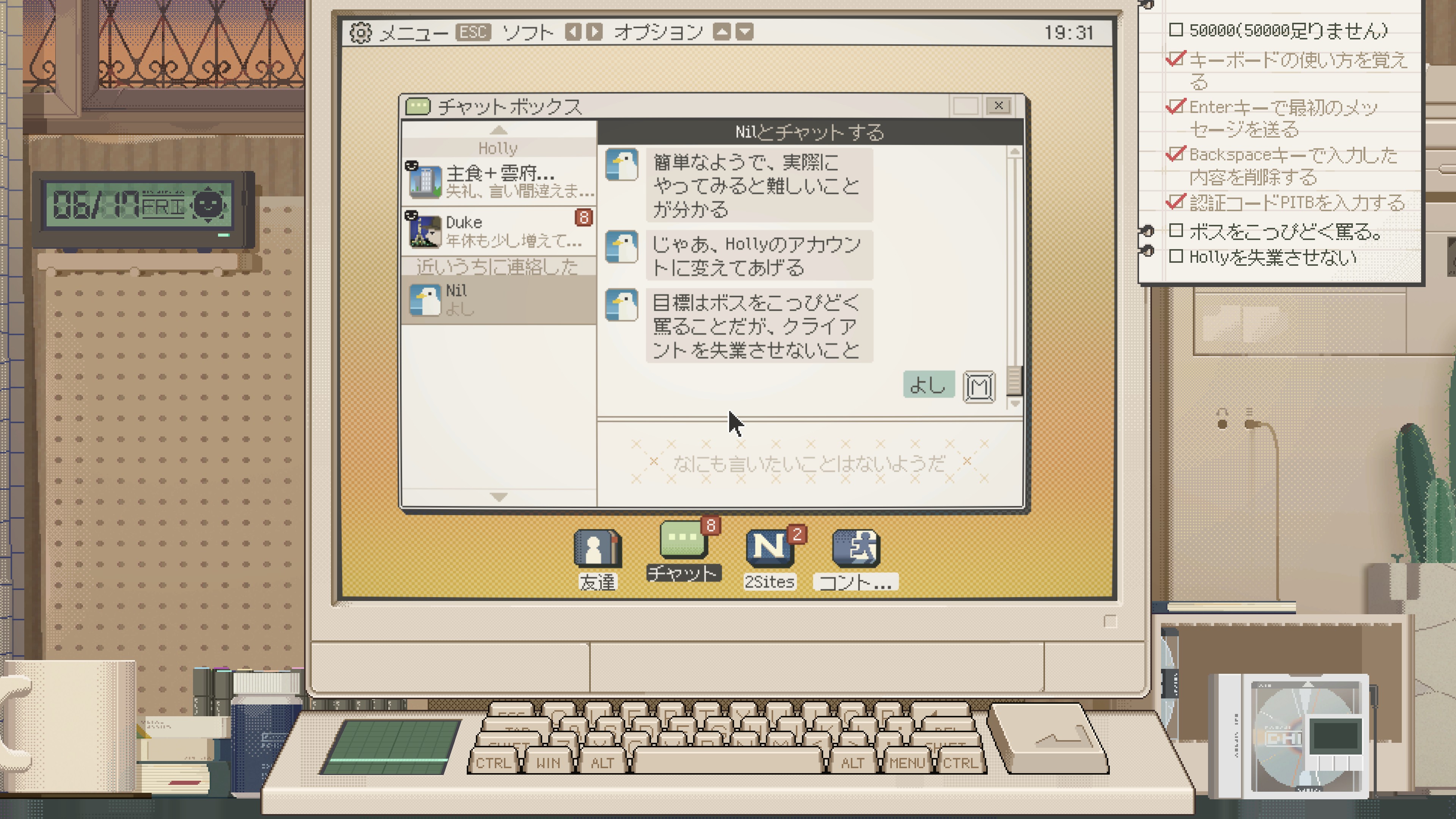 会話での自分の発言はよくある定型文を選択してく形式ではあるんだけど、自分でキーボード叩いて進行させてく操作感(どのキーを打っても決められたテキストが1文字ずつ入力される)とか、同時にいろんな相手と並行して仕事みたいにチャットするのがテンポよく感じたりして、まだ翻訳だいぶ怪しいけどそのへんちゃんと整ったら結構面白そうなので、発売されたら買ってプレイしたい。