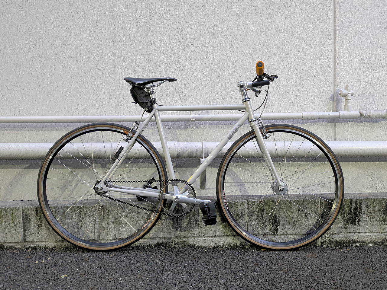 10数年ぶりの固定ギア。昔乗ってたからって変に知ったようなつもりで乗ると痛い目に遭うに違いない……みたいな過剰な自重から来るビビりもあって、とりあえずの試乗で跨ぐとこからおっかなびっくり、脚を止めてもペダルに持ってかれるあの感じで緊張感を味わう。ただ車体そのものの軽さだったりPhilwoodのハブで組んだ700cのホイールとスリックタイヤの漕ぎ出しやら諸々のダイレクト感はやっぱ気持ちよくて、やっぱこの感じなんだよな~と思ってしまう。